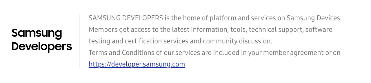 Below you'll find information about key services that will help you build and promote your app on Samsung devices and platforms. All are free to you as a program member: